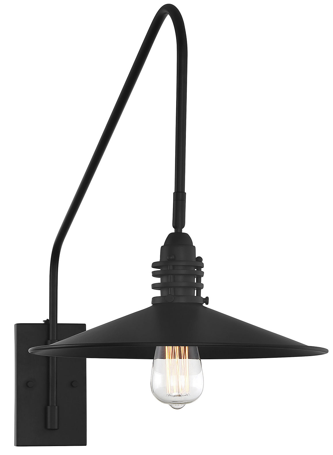 With its dramatically sweeping gooseneck arm and steel shade, the adjustable one-light Wheaton wall sconce makes a statement in a Matte Black finish. Measuring 14½" wide x 22" high x 38" extension, the sconce provides ample illumination from one 60-watt Edison-base bulb.