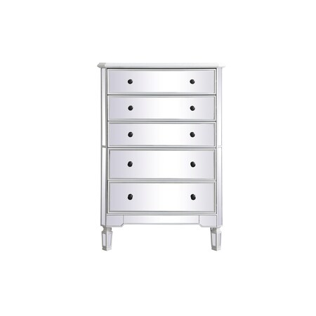 Make a striking statement with this gleaming mirrored five drawer vertical chest and live in the elegantly sleek future. Its contemporary style is defined by the alternating panels of polished beveled mirror panels. Its alternating panels that wrap around the entire cabinet creates an amusing design that everyone will enjoy and marvel at. Place this chest in your home and adorn it with your favorite objects?captivating art pieces, beautiful floral arrangements, or even personal treasures like family portraits. Ships fully assembled with the exception of installing the legs.