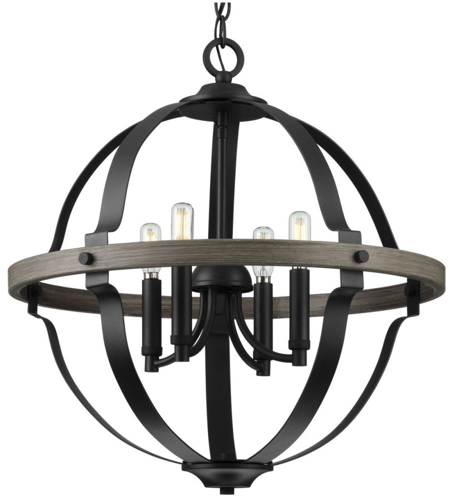 - MATTE BLACK FINISH: The open-cage sphere frame mixes a central band finished in a hand-painted aged oak faux wood with curved matte black metal arms that fills a room with substance without weight.