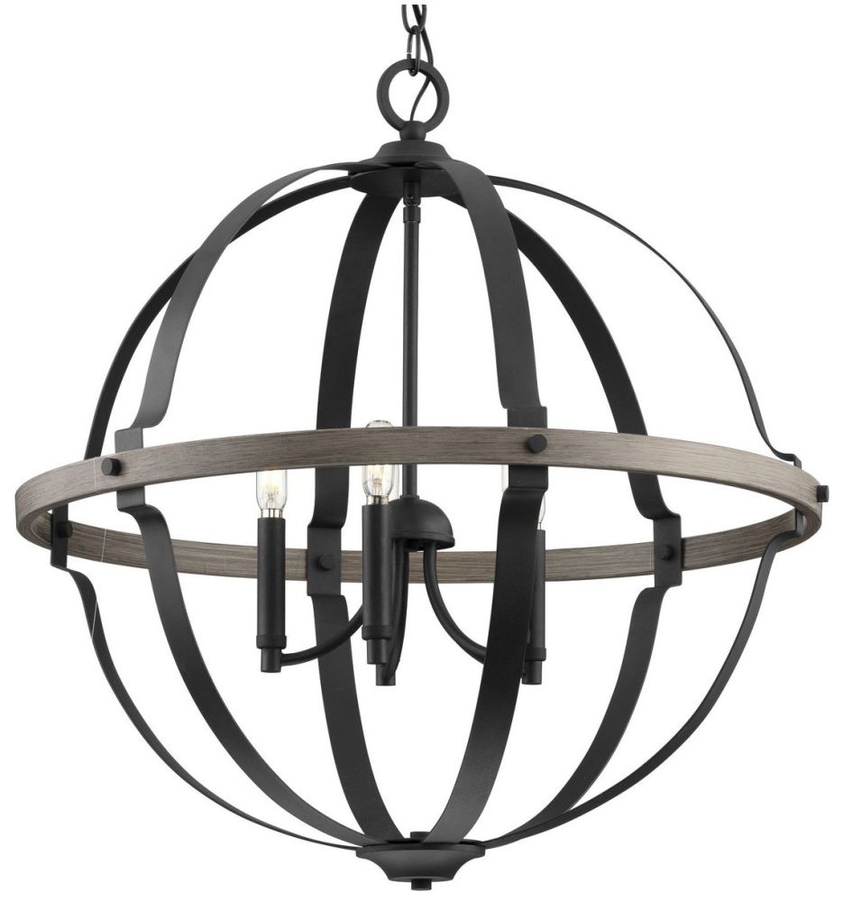- MATTE BLACK FINISH: The open-cage sphere frame mixes a central band finished in a hand-painted aged oak faux wood with curved matte black metal arms that fills a room with substance without weight.
