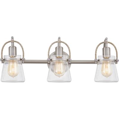 Evoking memories of time at sea, the Stafford collection of industrial inspired bath lights is presented by Quoizel. With a nautical themed profile, the shining brushed nickel brings traditional aesthetics into the modern day for a distinctly contemporary design. A series of seedy glass shades allow unfiltered light to diffuse throughout your bathroom area. Rated for use in damp location, these pieces can also be mounted with the lights facing up or down.