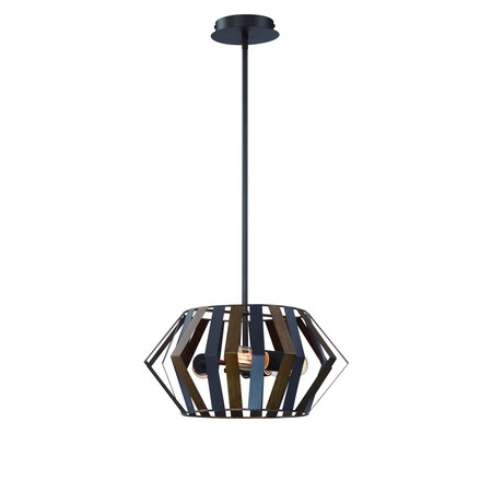 Alternating strips of matte black and darkwood, bent at different angles, surroundvintage lights. This 3-dimensional designcreates additional texture to this dynamiccollection. Two tone finish Darkwood/ midnight bronze two tone finish Open Cage 3 Dimensional Design Dynamic. <UL>Warranty: 12 Months<LI>No. of Rods: 5 / Assembly Required: Yes / Canopy Included: Yes / Sloped Ceiling Adaptable: Yes / Canopy Diameter: 5.5 x 1 / Rod Length(s): 18 / Dimable: Yes.