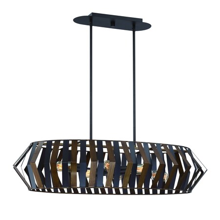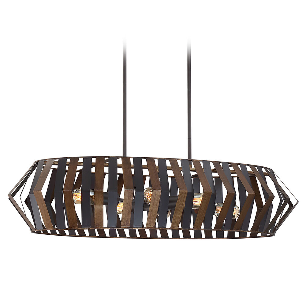 Eurofase Lighting-38269-011-Collection: Bevelo, Material: Steel/Acrylic, Width/Diameter: 2.75", Height: 8", Length: 36", Overall Length: 65.75", Lamp: 6-60w bulb(s), - Desc: Alternating strips of matte black and darkwood, bent at different angles, surround vintage lights. This 3-dimensional designcreates additional texture to this dynamic collection. Two tone finish Darkwood/ midnight bronze two tone finish Open Cage 3 Dimensional Design Dynamic. Warranty: 12 MonthsNo. of Rods: 5 / Assembly Required: Yes / Canopy Included: Yes / Sloped Ceiling Adaptable: Yes / Canopy Diameter: 13 x 5.5 x 0.75 / Rod Length(s): 18 / Dimable: Yes.-Bevelo - 6 Light Oval Chandelier in Transitional Industrial Style - 2.75 Inches Wide by 8 Inches High Wood/Bronze Finish