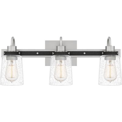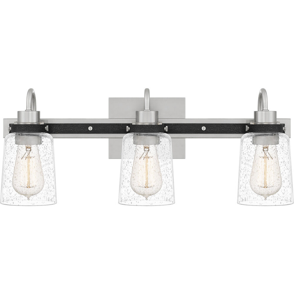 Inspired by industrial style lighting and modern bath lights, this three light design from the Quoizel brand is sure to brighten your vanity decor. It features a brushed nickel finish wallplate and arms with a black finish accent. Raised screw heads add to the industrial look, and the design has clear seeded glass.