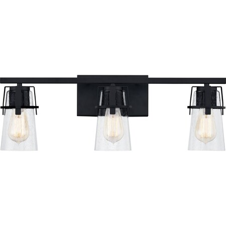 Add an industrial feel to your home with the clean lines and simple silhouette of the Knox collection. Clear seeded glass shades are accentuated by a Matte Black frame and rectangular backplate. Choose from multiple size options in this versatile collection, and add in vintage light bulbs for the ultimate ambiance. Matte black finish Clear seeded glass shades Durable steel construction Uses (3) 100-watt medium base bulbs (sold separately) Ideal for transitional, industrial settings ETL Listed for use in damp locations Includes all required hardware and instructions for easy installation. Room Recommendation: Bathroom / Mounting Direction: Up/Down / Assembly Required: Yes / Shade Included: Yes / Cord Length: 6.00 / Dimable: Yes.