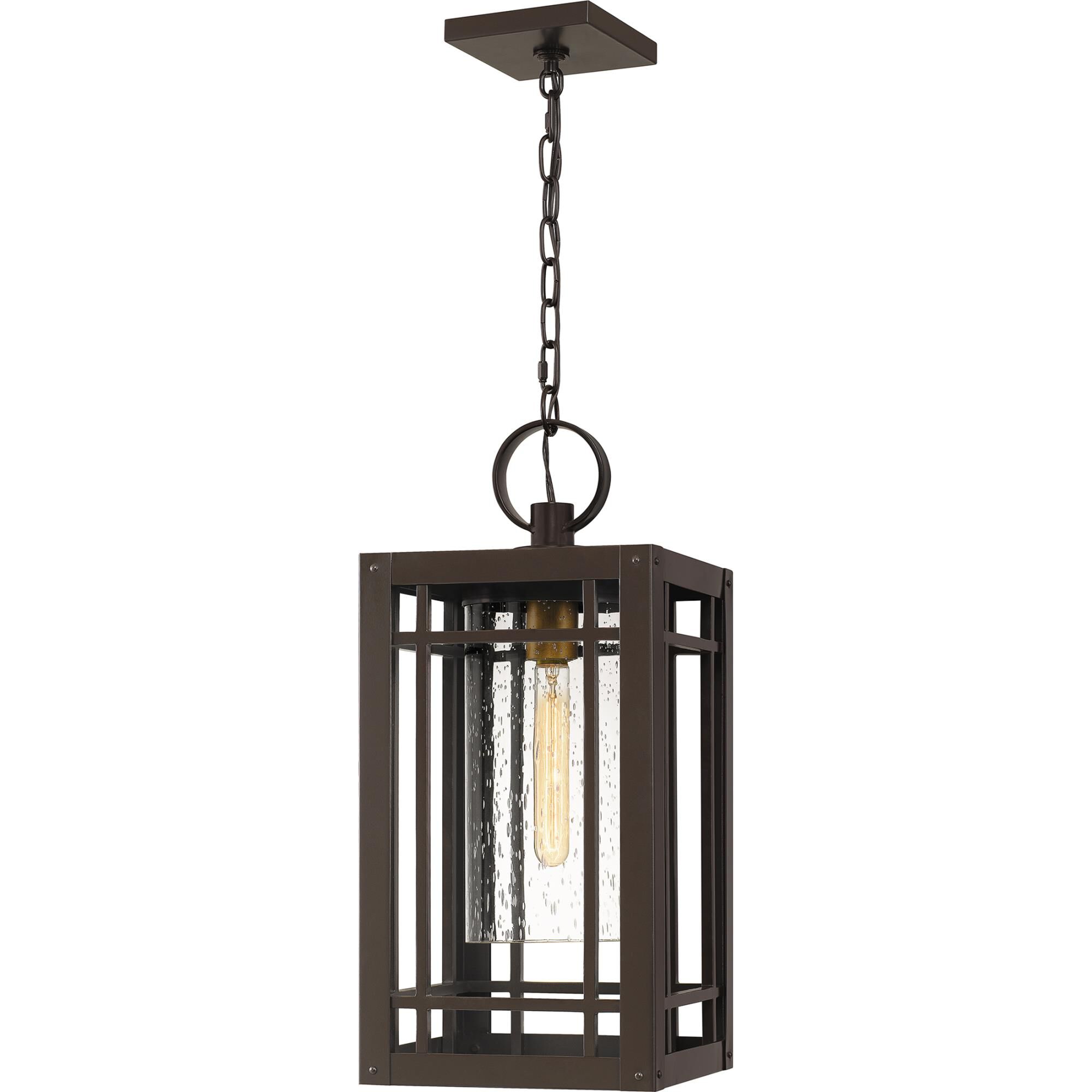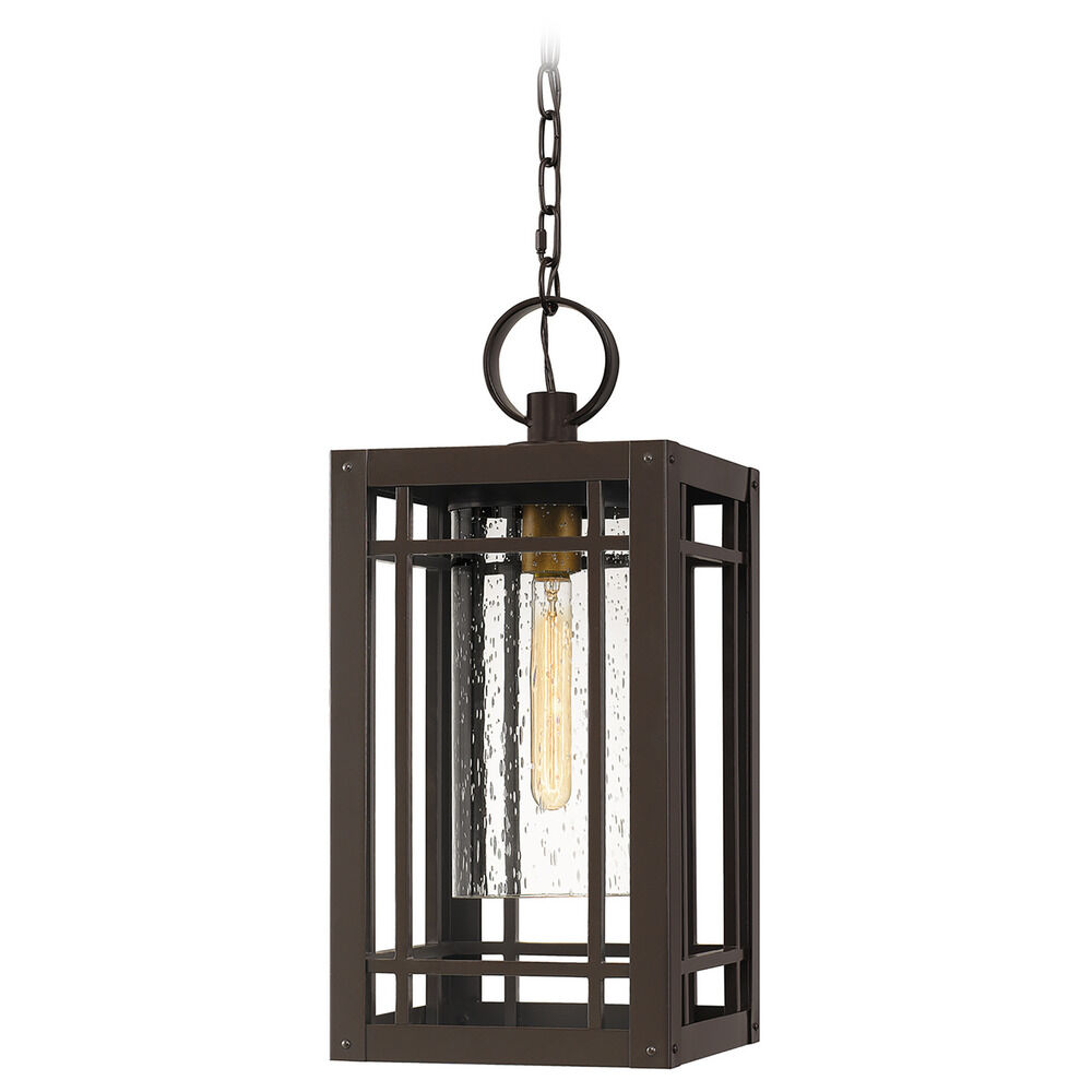 A classic lantern design comes to life with the Pelham collection of outdoor lighting fixtures, presented by Quoizel. Bring clean transitional style to your home's outdoor areas with the deep western bronze finish, creating a profile reminiscent of traditional rustic farmhouse styles. Clear seedy glass panels house the fixture's single bright bulb, casting illumination wherever needed. Damp rated for use in the outdoors, this hanging light is a great addition to a covered patio.