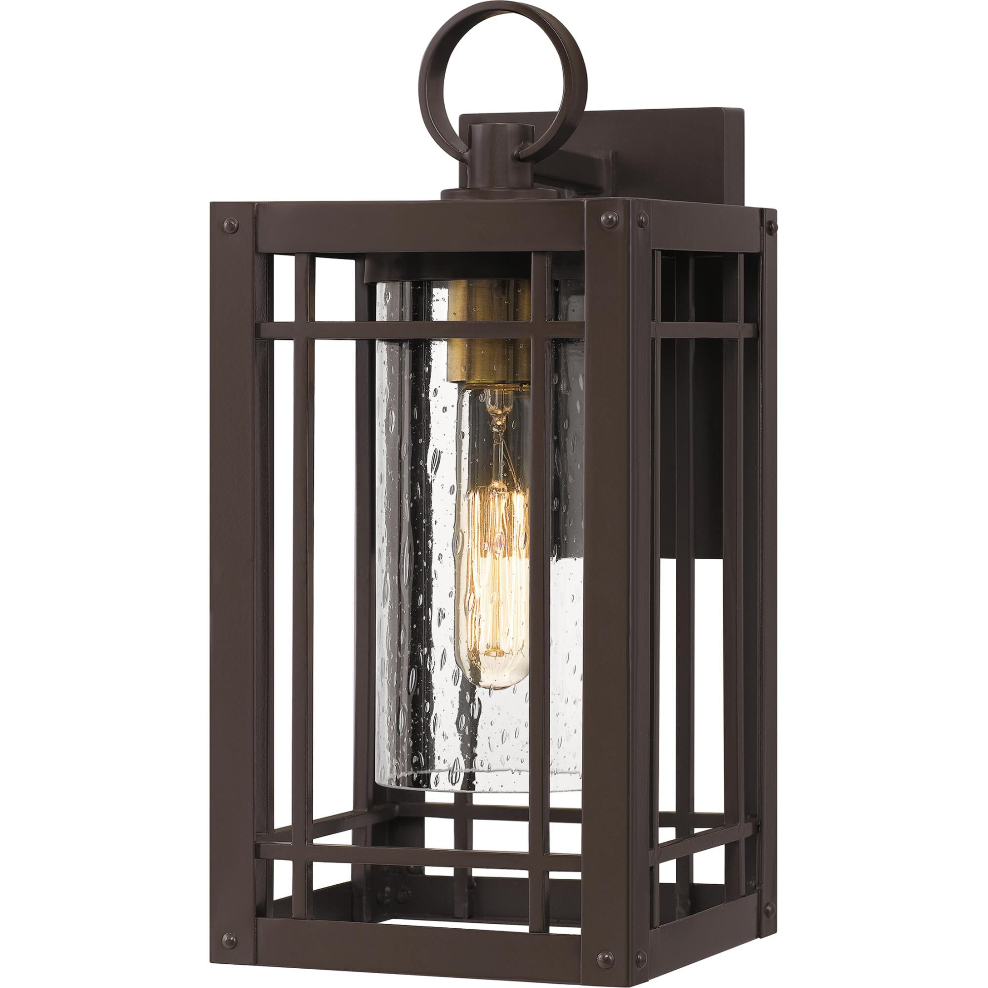 A classic lantern design comes to life with the Pelham collection of outdoor lighting fixtures, presented by Quoizel. Bring clean transitional style to your home's outdoor areas with the deep western bronze finish, creating a profile reminiscent of traditional rustic farmhouse styles. Clear seedy glass panels house the fixture's single bright bulb, casting illumination wherever needed. Damp rated for use in the outdoors, this wall light is a great addition to a covered patio or walkway.