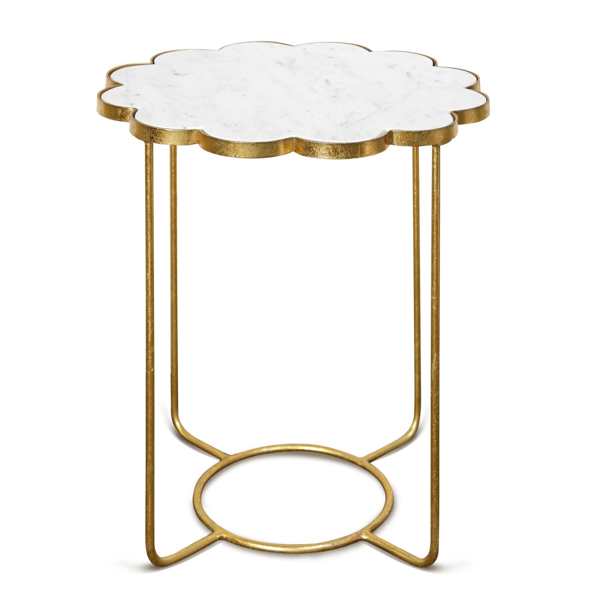 A white marble top and a gold finish complement each other in contemporary fashion in the Galaxia accent side table. The table top has a flower shape while the legs at the base come together to feature a unique circular design. This charming side table is sure to fit in beautifully with modern furnishings in the living room. Due to the production process, each piece is unique and no two are exactly alike This accent table has a flower edge design in natural white marble table top. The base legs of this accent table is finished in a unique design. The base legs of this accent table is finished in brass metal. This accent table stands at about 21.5 Inch in height.