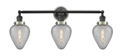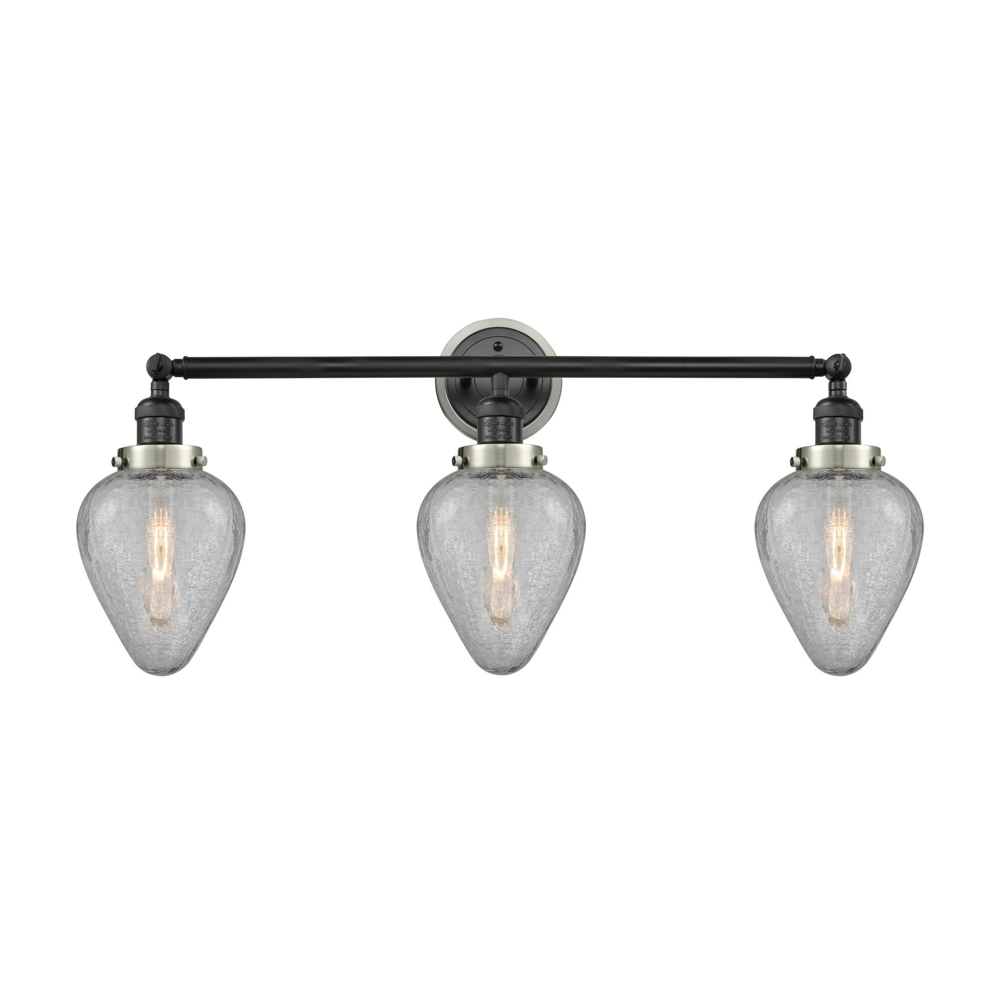 INNOVATIONS 205BK-BPSN-HRSN-G165 3-Light Bath Vanity Light Matte Black. Collection: Franklin Restoration. Style: Industrial, Restoration-Vintage. Metal Finish: Matte Black. Metal Finish (Canopy/Backplate): Matte Black. Accent Color: Brushed Satin Nickel Fitter. Material: Steel, Cast Brass, Glass. Dimension(in): 14(H) x 32(W) x 8(Ext). Bulb: (3)60W Medium Base,Dimmable(Not Included). Maximum Wattage Per Socket: 100. Voltage: 120. Color Temperature (Kelvin): 2200. CRI: 99.9. Lumens: 220. Glass Shade Description: Clear Crackle Geneseo. Glass or Metal Shade Color: Clear Crackled. Shade Material: Glass. Glass Type: Crackled. Shade Shape: Crackled. Shade Dimension(in): 6.5(W) x 8.75(H). Fitter Measurement (Glass Or Metal Shade Fitter Size): 3.25 inch Fitter. Backplate Dimension(in): 5.5(Dia) x 1(Depth). ADA Compliant: No. California Proposition 65 Warning Required: Yes. UL & ETL Certification: Damp Location.