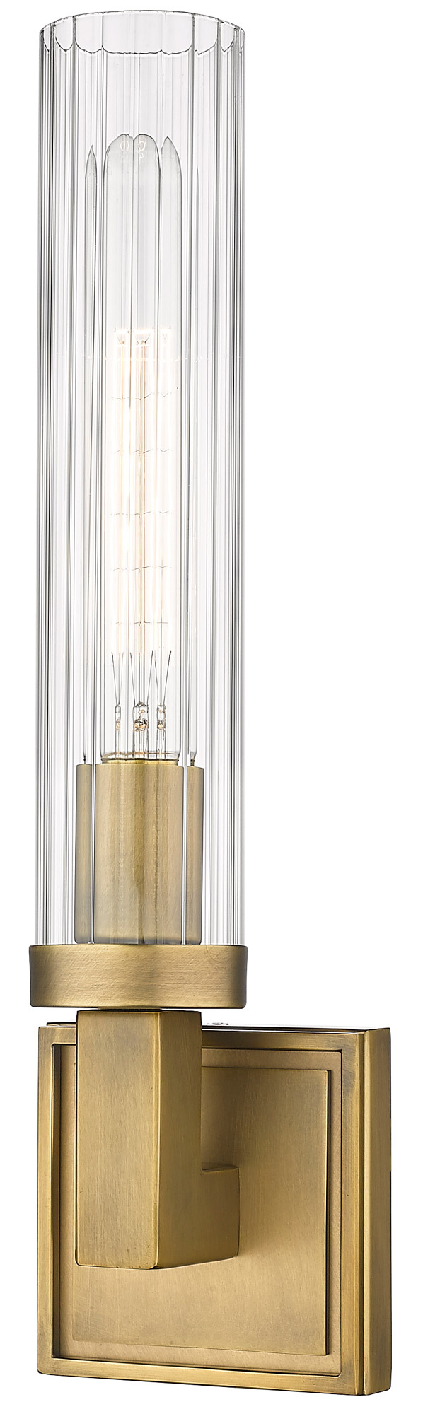 Collection: Beau, Material: Glass, Finish Color: Rubbed Brass, Width: 4.5", Height: 16.75", Length: 3.75", Depth: 3.75", Backplate Width: 4.5", Backplate Length: 4.5", Lamping Type: Incandescent, Number Of Bulbs: 1, Wattage: 60 Watts, Dimmable: Yes, Moisture Rating: Damp Rated, Desc: The classic look of traditional candlesticks receives a modern update with fluted glass shades that bring a touch of elegance. The slim profile of the Beau sconce allows it to be placed almost anywhere. The steel frame can be finished in Polished Nickel for contemporary flair, Bronze for a traditional environment, or Rubbed Brass to suit transitional decor. Several sizes and configurations are available. Room Recommendation: Bathroom/Powder Room/Bedroom/Hallway / Dimmable: Yes / Shade Included: Yes. ,