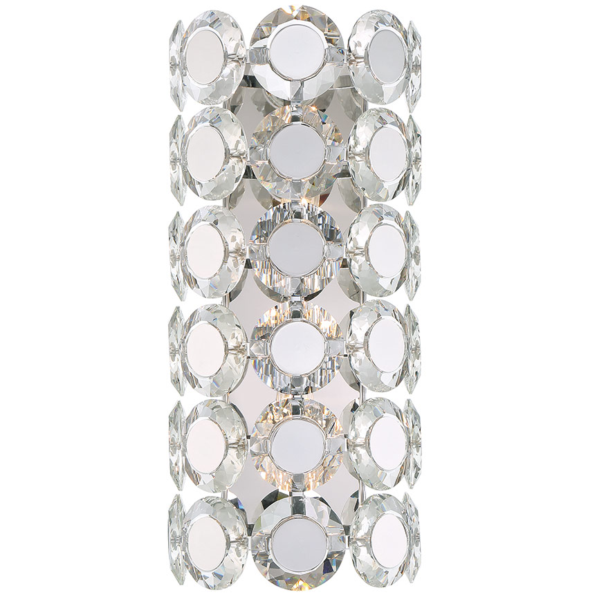 Collection: Perrene, Material: Steel, Finish Color: Chrome, Width: 8.5", Height: 19", Depth: 6", Backplate Width: 4.75", Backplate Length: 1", Lamping Type: Incandescent, Number Of Bulbs: 2, Wattage: 60 Watts, Dimmable: No, Moisture Rating: Dry Rated, Desc: Our Lavish Perrene Collection Is A True Statement Piece; Ordained With Coveted Crystals, Both Sides Showcase Beveled Texture That Brings Dramatic Elegance. The Mirrored Chrome Center Helps Reflect The Light For An Even More Opulent Display Of Light. Indulge With The Perrene Collection Today. Crystal Dish. Room Recommendation: Living Room/Entryway / Assembly Required: Yes / Mounting Direction: Multi / Back Plate Height: 1.00 / Back Plate Width: 4.75 / Sloped Ceiling Adaptable: Yes / Dimmable: Yes . ,