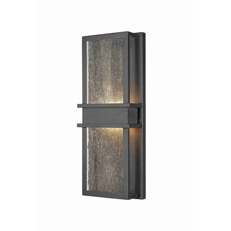 Collection: Eclipse, Material: Aluminum, Finish Color: Black, Width: 7", Height: 18", Length: 3.25", Depth: 3.25", Lamping Type: LED, Number Of Bulbs: 2, Wattage: 10 Watts, Cri: 90, Color Temperature: 2700 Kelvin, Lumens: 350, Dimmable: Yes, Moisture Rating: Wet Rated, Desc: A bold contemporary design, Eclipse supplies ample illumination (including upward and downward light) without any glare, thanks to a cleverly engineered central band that conceals the long-lasting LED light source. This contemporary fixture casts a warm, soft glow behind the beautiful, seeded glass front panel. A handsome Black finish completes the upscale look. Room Recommendation: Outdoor Living / Dimmable: Yes / Shade Included: Yes. ,