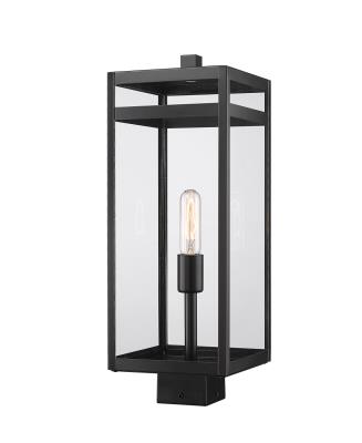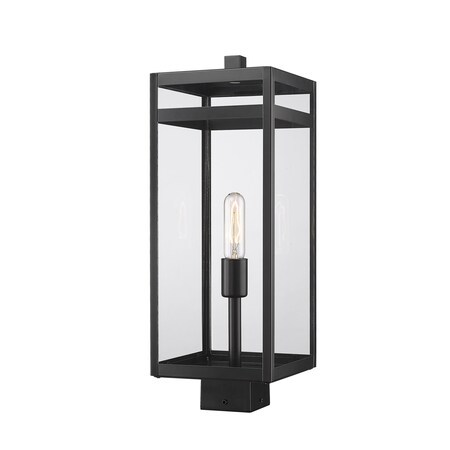 Collection: Nuri, Material: Aluminum, Finish Color: Black, Width: 7.5", Height: 21", Length: 7.5", Lamping Type: Incandescent, Number Of Bulbs: 1, Wattage: 100 Watts, Dimmable: Yes, Moisture Rating: Wet Rated, Desc: With an orderly geometric motif, the Nuri one-light outdoor post mount fixture tops an existing post in an exterior residential or commercial space. Embrace modern elegance with a crisp linear aesthetic joining a minimalist look with the charming embellishment of a slender bulb base. Clear glass panels maintain focus on the dramatic black outline of a classic fixture.,