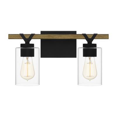 - Matte black finish over steel construction. Clear glass shades. Rustic wood accent.