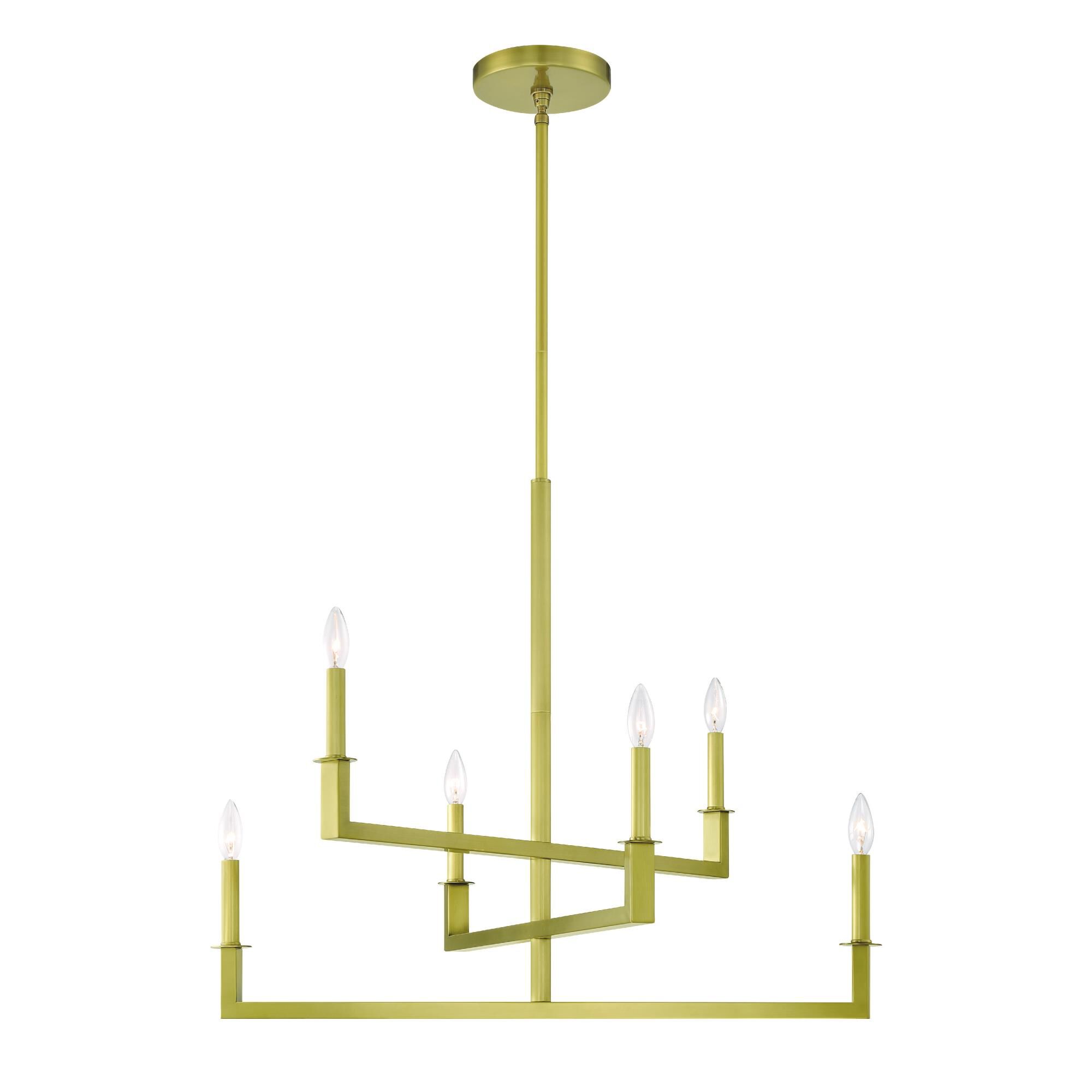 Highlight a modern dining or living space with the geometric aesthetic and elegant simplicity of this modern glam six-light chandelier. From the Dante collection by Crystorama, its layered design is crafted of aged brass finish steel, capped with candelabra-style bulb sockets. Bring just the right amount of elegance to a contemporary living or dining space as you infuse ambient lighting.