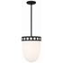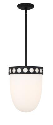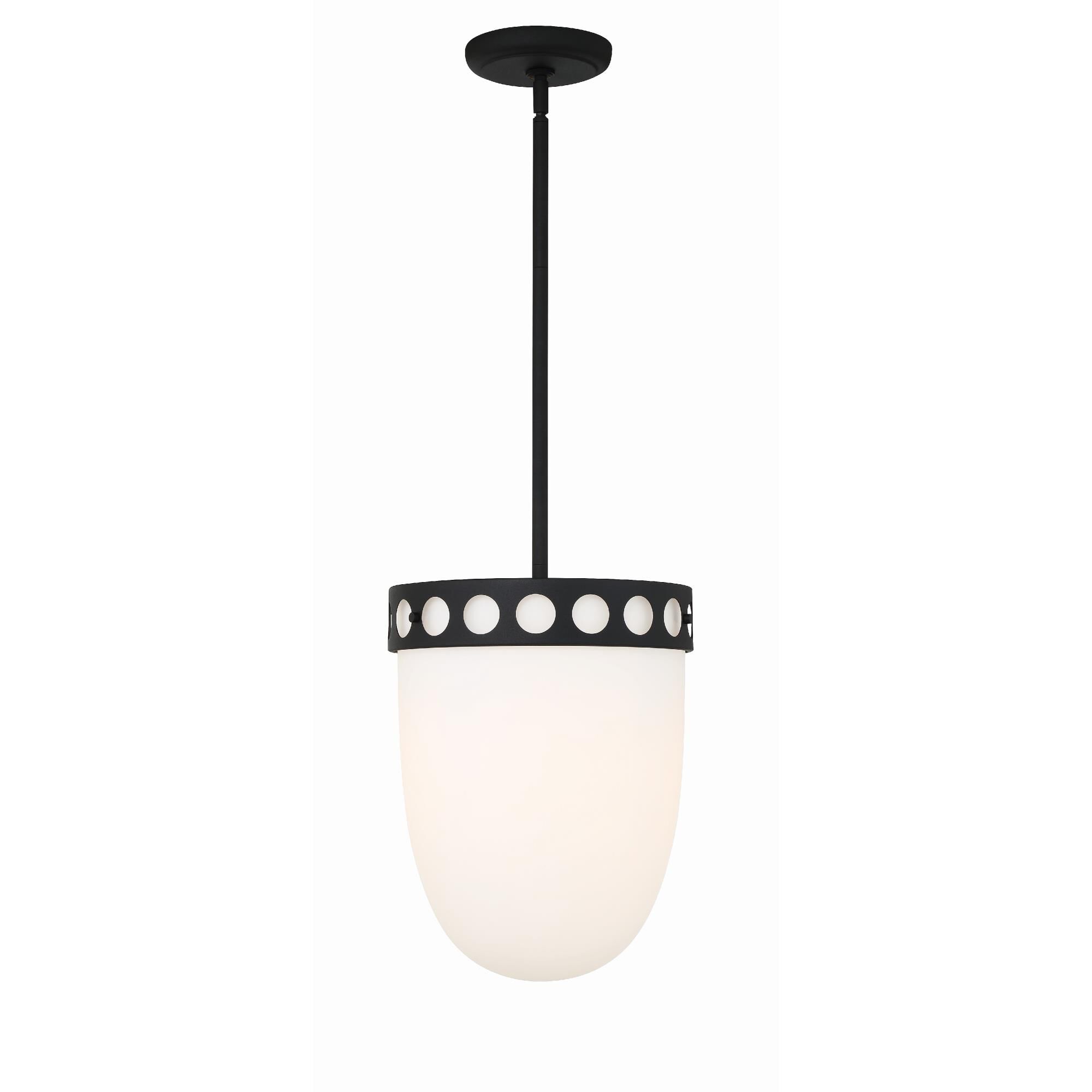 A whimsical approach blends artistry, simplicity, and style to fashion a light fixture worthy of a custom space. This modern pendant from the Kirby collection by Crystorama focuses on simple elements highlighted by a shapely illuminated white glass shade. Framed with a black forged finish steel band featuring charming cutout circles, this pendant makes a statement in any space.