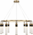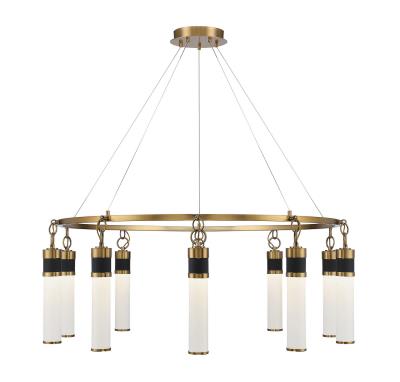 The Savoy House Abel 10-light chandelier flaunts a sleek and airy look that creates a robust presence in any space. Glass shades are suspended from a circular band and feature smaller ring accents. Integrated LED lights contribute to the sleekness and a matte black finish with warm brass accents adds richness. Abel is 45" in width and has an adjustable height ranging from 17" to 137". Comes with 120" of cord.