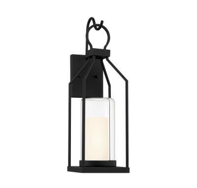 Light the way home with the lantern-inspired style of the Savoy House Hamilton 1-light outdoor wall light. A white opal glass shade, held within a protective clear glass shade, bring to minds the look of candlelight. The matte black finish makes Hamilton a great choice for lighting a wide variety of homes. Hamilton is 21" in height, 6.5" in width and extends 8" from the wall. It uses one candelabra size bulb of up to 60 watts per bulb. Wet area rated.