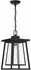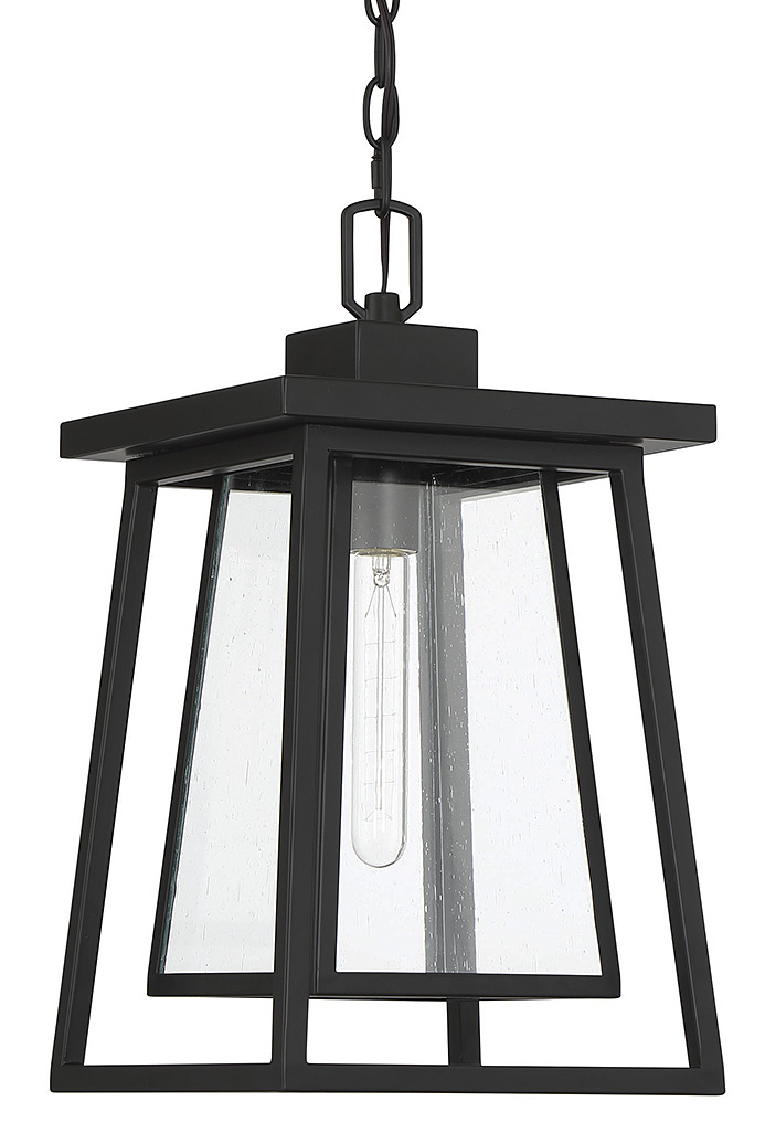 Boost your curb appeal and create a great first impression with the Craftsman-inspired style of the Savoy House Denver 1-light outdoor hanging lantern. Clear seedy glass and a matte black finish make Denver a great choice for lighting up today's fashionable homes. This fixture is 16.125" in height and 8" in width. It uses one standard size bulb with a max of 60 watts. Damp area rated. Comes with 120" of chain and 144" of cord.