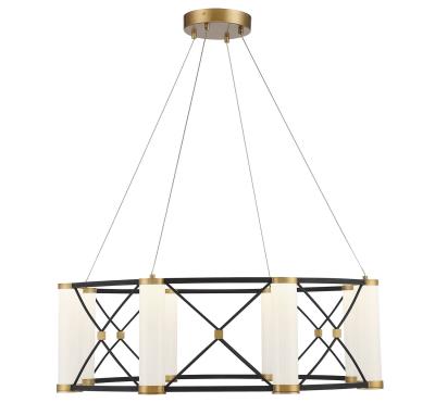 The Savoy House Aries 8-light pendant flaunts a sleek and airy look that creates a robust presence in any space. A bracelet-like open drum shade is adorned with tubes of white opal glass and finished in the rich combination of matte black with warm brass. Integrated LED lights contribute to the sleekness. Aries is 34" in diameter and has an adjustable height ranging from 10" to 130". Comes with 120" of cord.