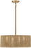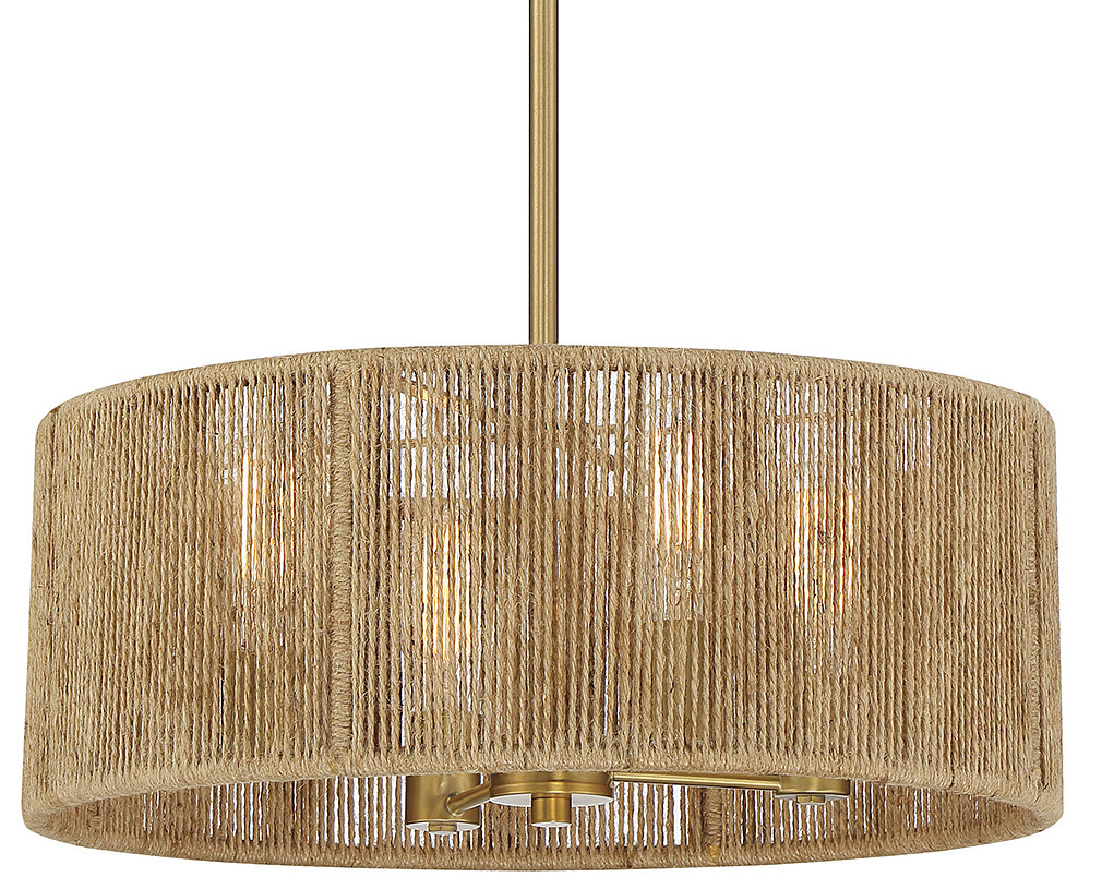 This Savoy House Ashe 4-light pendant has a warm, organic design. Its drum shade is strung with rows of textured rope, allowing light to shine through and providing a stylish look even when the lights are off. Finished in warm brass. Ashe is 20" in width and has an adjustable height ranging from 8" to 62". It uses four standard size bulbs with a max of 60 watts per bulb. Comes with four 12" downrods and one 6" downrod, plus 80" of cord.