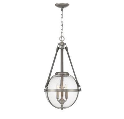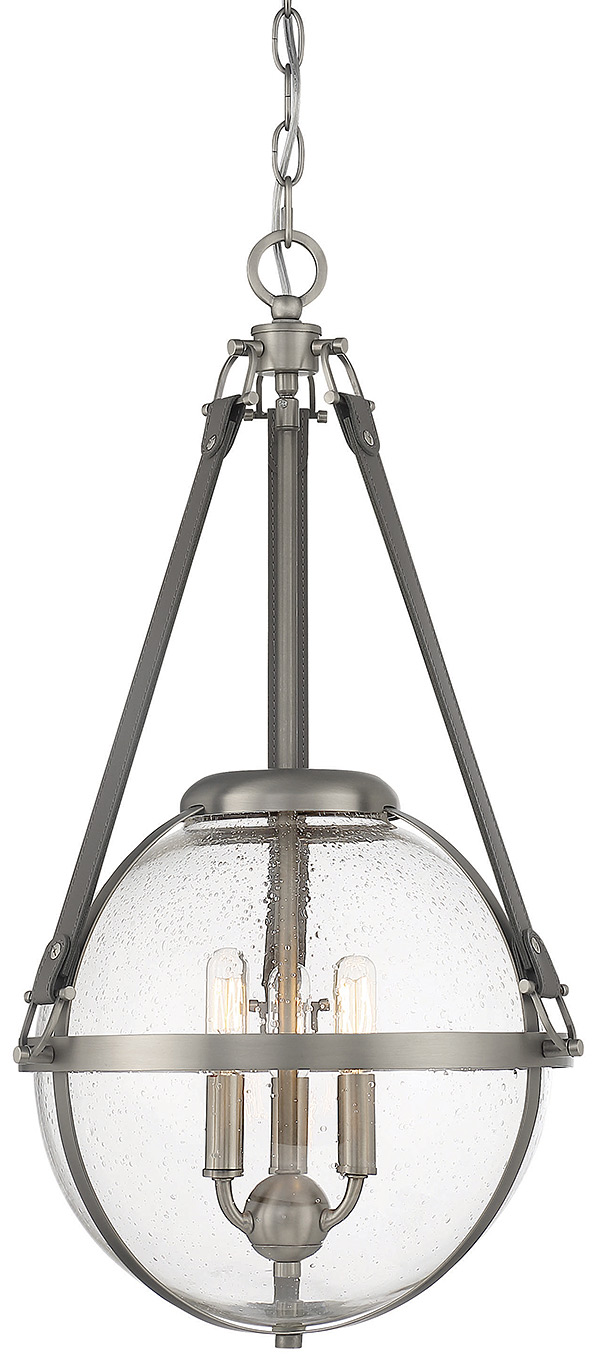 The Savoy House Bozeman 3-light pendant is a design that brings a touch of refined, equestrian-inspired style to your home. A seeded glass orb is held in place with straps of charcoal leather that pair perfectly with the antique nickel finish. Bozeman is 25" in height and 14" in width. It uses three candelabra size bulbs of up to 60 watts per bulb. Comes with 120" of chain and 144" of cord.