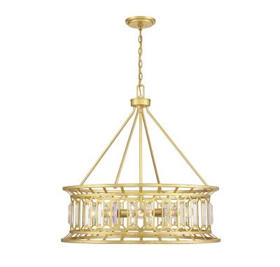 Boldly, geometrically styled, the Daintree 8-light pendant from Savoy House showcases baguette-cut crystal within an intricate frame. It is finished beautifully in shining True Gold. Daintree is 30" in height and 30" in diameter. Uses eight standard size bulbs of up to 60 watts per bulb. Comes with 120" of chain and 144" of cord.