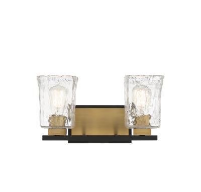 A fashionable blend of matte black and warm brass makes this Savoy House Sidney 2-light bathroom vanity light a bold choice for the bath. Highly textured clear water glass shades add an extra dimension of intrigue. Sidney is 8" in height and 14.75" in width. It extends 6.75" from the wall. Uses two standard size bulbs of up to 60 watts per bulb. Damp area rated.