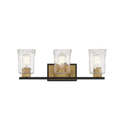 A fashionable blend of matte black and warm brass makes this Savoy House Sidney 3-light bathroom vanity light a bold choice for the bath. Highly textured clear water glass shades add an extra dimension of intrigue. Sidney is 8" in height and 23" in width. It extends 6.75" from the wall. Uses three standard size bulbs of up to 60 watts per bulb. Damp area rated.