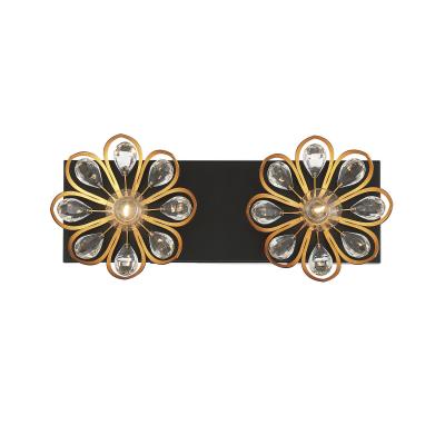 Why not have some fun with your bath lighting? The Savoy House Poppy 2-light bath vanity light flaunts a duo of lovely metal flowers, finished in warm brass and adorned with clear crystal petals. The lights act as the center of each flower. Matte black finish. Poppy is 6.5" in height, 15" in width and extends 3.75" from the wall. It uses two candelabra size bulbs of up to 60 watts per bulb. Damp area rated.