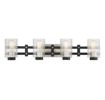 This Savoy House Colt 4-light bath vanity light is sure to add bright light and big style to any bath! Get intriguing texture with the clear hobnail glass shades and be marveled by the uniquely patterned backplate in satin nickel and matte black finishes. Colt is 7" in height, 32" in width and extends 6" from the wall. It uses four standard size bulbs of up to 60 watts per bulb. Damp area rated.
