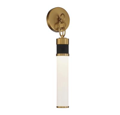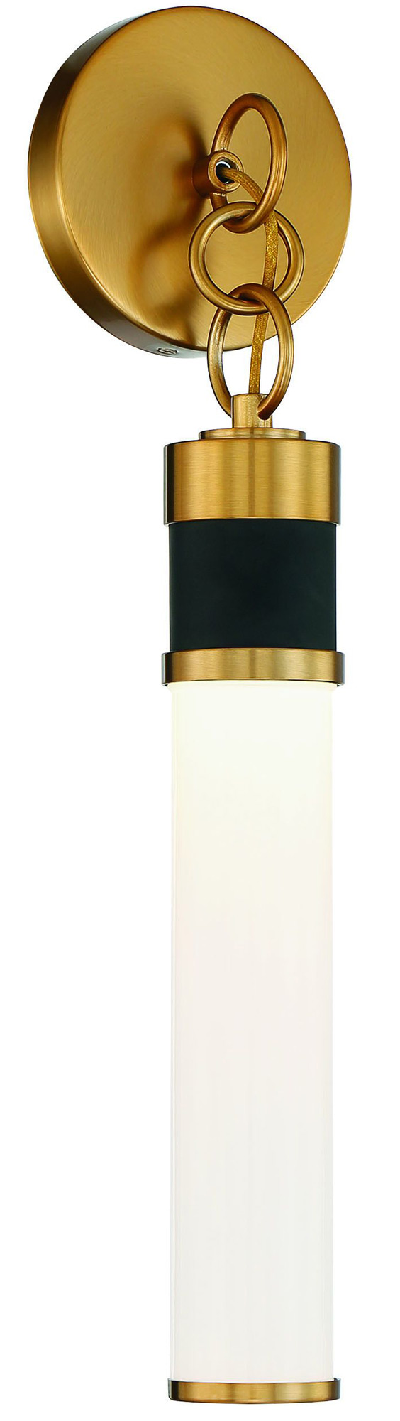 The Savoy House Abel 1-light sconce flaunts a sleek and airy look that creates a robust presence in any space. A tube of white opal glass is accentuated by ring accents and thoughtful hardware detailing in a rich combination of matte black with warm brass. An integrated LED light source contributes to the sleek style. Abel is 19.5" in height, 5" in width and extends 4" from the wall. Damp area rated.