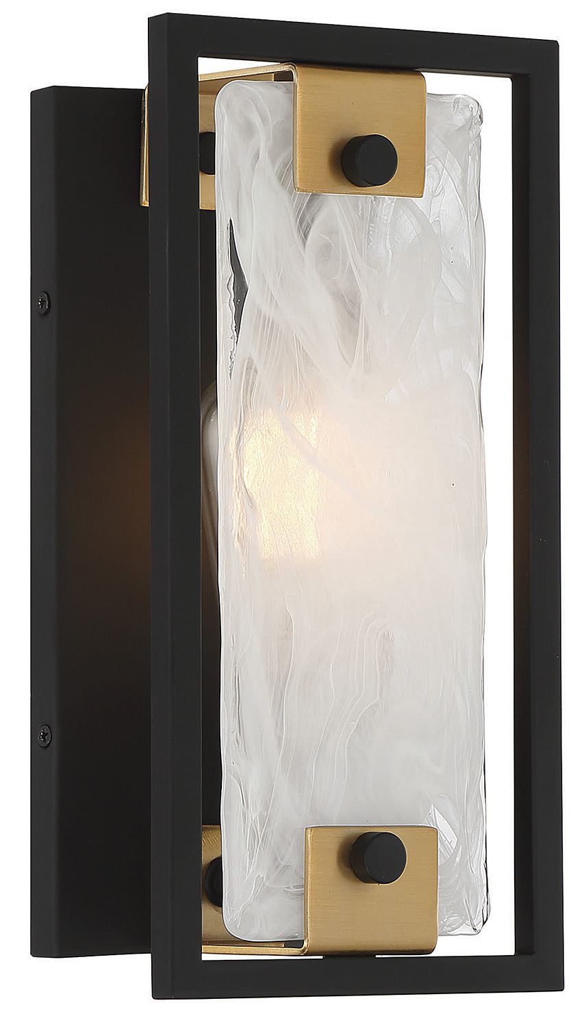 Swirling, mesmerizing strie piastra glass frames the light within the Savoy House Hayward 1-light sconce. The matte black frame showcases warm brass accents for another dimension of style. Hayward is 12" in height, 6" in width and extends 4.5" from the wall. It uses one standard size bulb of up to 60 watts per bulb.