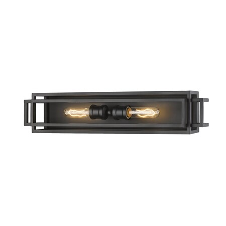 Collection: Titania, Material: Steel, Finish Color: Matte Black, Width: 4.75", Height: 24", Length: 4.25", Backplate Width: 21", Backplate Length: 4.75", Lamping Type: Incandescent, Number Of Bulbs: 2, Wattage: 60 Watts, Dimmable: Yes, Moisture Rating: Damp Rated, Desc: Create a sophisticated industrialized feel to bathroom retreats and communal powder rooms with this linear two-light vanity fixture. Set within a matte black cage made of slim steel frames, dual exposed bulbs create a soft illumination across vanity countertops, creating a modern architectural look and feel. A perfect opportunity to offer the romantic flicker of an Edison style bulb, creating a chic contemporary retreat.,