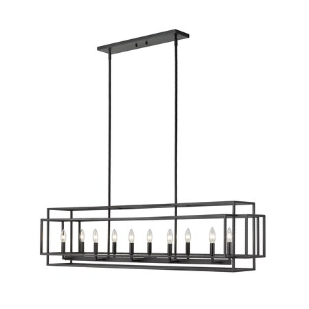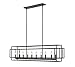 Collection: Titania, Material: Steel, Finish Color: Matte Black, Width: 13", Height: 13", Length: 54", Lamping Type: Incandescent, Number Of Bulbs: 10, Wattage: 60 Watts, Dimmable: Yes, Moisture Rating: Damp Rated, Desc: Create a modern architectural feel to kitchen islands, countertops and more with this grand linear ten-light island pendant, featuring an oversized and elongated open and airy slim steel cage in a dramatic matte black finish. Frank Lloyd Wright-inspired influences carry through in its elongated horizontal frame, offering a minimalist industrial aesthetic that showcases a row of ten candelabras that project a lovely illumination across tablescapes. Dual suspension rods mirror the slender wire-like cage and offer additional security.,