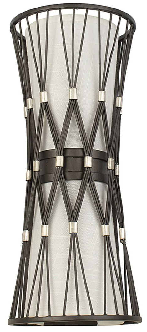 The Savoy House Joliet 2-light sconce flaunts a curving look that brings organic style inspirations to mind. Central slender shades are surrounded by an outer shade with an intricate and eye-catching pattern of slender metal rods. The rich brown Rumba finish offsets the lighter-colored shades perfectly. Joliet is 14" in height, 6" in width and 5.25" in extension. It uses 2 candelabra size bulbs of up to 60 watts each (bulbs not included).