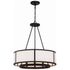 Showcasing a classic drum pendant, the Bryant is crafted with a white silk shade and black steel frame. The outer drum surrounds an inner suspension of candelabra sockets. The contrasting materials and bold graphic lines provide a design-driven style and a striking visual accent to many interior settings