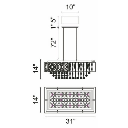 The Eternity 12 Light Chandelier radiates a charming personality. The glittering drops of round crystals provide softness and balance to the rectangular shade's sharp edges and laser-cut design. Consider the statement-making focal point that will catch the attention of guests who'll visit your chic home. Lighting is jewelry for the home, and there is the perfect piece for every room. This fixture is done in a beautiful chrome finish which could be the missing piece to lighten up and fall in love with your space all over again.<br/><br/>Features :<br/><br/>- Feel confident with your purchase and rest assured. This fixture comes with a one year warranty against manufacturers defects to give you piece of mind that your product will be in perfect condition.<br/>- Dimensions: H 12" x W 14" x L 31"<br/>- Chrome Finish - G9 Bulb Not Included - Indoor (Dry Location)<br/>- cETLus Approved<br/>- Includes Assembly Instructions and Hardware.<br/>- Compatible With Standard Low Voltage Dimmer<br/>- Comes With 72" of rods.<br/><br/>Specifications :<br/><br/>- Number of Lights : 12<br/>- Voltage : 120v<br/>- Bulb Type : G9<br/>- Warranty Description : One year warranty against manufacturers defect<br/>- Installation Type : Hardwired<br/>- Material : Metal.