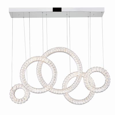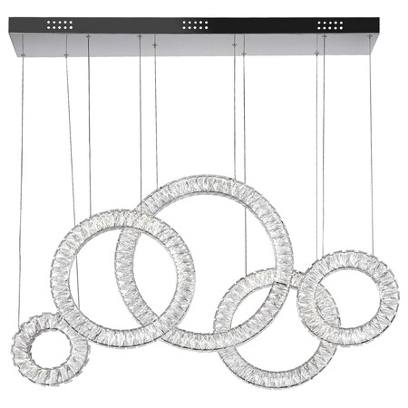 The 43 inch Celina LED Chandelier Pool Table/Island Light would make a fine focal point in itself even when unlit. This oversized pendant light features five interlocking rings wrapped in glittering crystals. A rectangular chrome canopy holds the ring in place in linear formation. This striking light fixture can certainly provide any space with great lighting and ambiance.Lighting is jewelry for the home, and there is the perfect piece for every room. This fixture is done in a beautiful chrome finish which could be the missing piece to lighten up and fall in love with your space all over again.<br/><br/>Features :<br/><br/>- Feel confident with your purchase and rest assured. This fixture comes with a three years warranty against manufacturers defects to give you piece of mind that your product will be in perfect condition.<br/>- Dimensions: H 24" x W 8" x L 43"<br/>- Chrome Finish - Integrated LED Bulb Included - Indoor (Dry Location)<br/>- cETLus Approved<br/>- Includes Assembly Instructions and Hardware<br/>- Compatible With Standard Low Voltage Dimmer.<br/><br/>Specifications :<br/><br/>- Number of Lights : 5<br/>- Voltage : 120v<br/>- Bulb Type : Integrated LED<br/>- Warranty Description : Three years warranty against manufacturers defect<br/>- Installation Type : Hardwired<br/>- Material : Metal.
