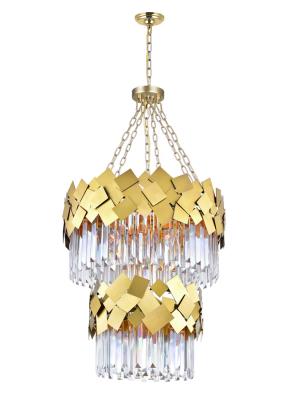 Go bold with your light fixture and let this Panache 10 Light Down Chandelier in Medallion Gold add big drama into your space. This two tier pendant features a 24 inch and a 16 inch circular shade with metal and crystal accents. The adjustable golden chain allows you to suspend this fixture from the ceiling according to your preferred height. This chandelier has a candelabra base.