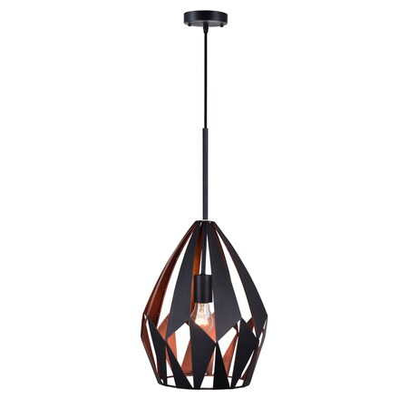 - So your neutral palette too bland? Add warmth and elegance with this Oxide 20 inch Single Light Pendant. Suitable in the dining room, kitchen, or foyer, this light source can give your space an edgy style. The geometric shade displays an angular open metal work finished in black on the outside and copper on the inside. This fixture is a brilliant way to bring an affordable touch of elegance to your interiors.