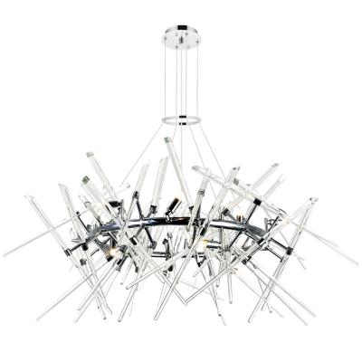 The Icicle 12 Light Chandelier is not for the faint of heart. This striking wreath-like light fixture has a round metal frame in chrome with spiking rods made from clear glass. The impressive architectural pendant has a 42 inch diameter and an 18 inch height. Twelve bulbs nestled within the sculpture reflects and refracts light. The visual aesthetics of this piece will add intrigue to any room.Lighting is jewelry for the home, and there is the perfect piece for every room. This fixture is done in a beautiful chrome finish which could be the missing piece to lighten up and fall in love with your space all over again.<br/><br/>Features :<br/><br/>- Feel confident with your purchase and rest assured. This fixture comes with a one year warranty against manufacturers defects to give you piece of mind that your product will be in perfect condition.<br/>- Dimensions: H 18" x W 42" x L 42"<br/>- Chrome Finish - G9 Bulb Not Included - Indoor (Dry Location)<br/>- cETLus Approved<br/>- Includes Assembly Instructions and Hardware<br/>- Compatible With Standard Low Voltage Dimmer.<br/><br/>Specifications :<br/><br/>- Number of Lights : 12<br/>- Voltage : 120v<br/>- Bulb Type : G9<br/>- Warranty Description : One year warranty against manufacturers defect<br/>- Installation Type : Hardwired<br/>- Material : Metal.