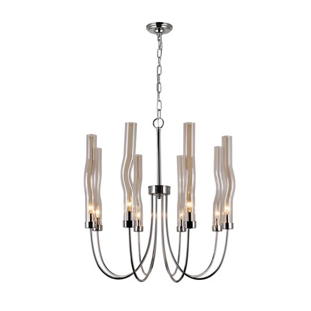 Completely transform the ambiance of a space by updating the light fixture with this Meduse 8 Light Chandelier. Finished in polished nickel, this transitional up chandelier with an adjustable chain, curved champagne-colored glass tubes, and candelabra-style bulbs will bring a touch of Art Nouveau allure to wherever you place it.Lighting is jewelry for the home, and there is the perfect piece for every room. This fixture is done in a beautiful polished nickel finish which could be the missing piece to lighten up and fall in love with your space all over again.<br/><br/>Features :<br/><br/>- Feel confident with your purchase and rest assured. This fixture comes with a one year warranty against manufacturers defects to give you piece of mind that your product will be in perfect condition.<br/>- Dimensions: H 24" x W 21" x L 21"<br/>- Polished Nickel Finish - E12 Bulb Not Included - Indoor (Dry Location)<br/>- cETLus Approved<br/>- Includes Assembly Instructions and Hardware<br/>- Compatible With Standard Low Voltage Dimmer.<br/><br/>Specifications :<br/><br/>- Number of Lights : 8<br/>- Voltage : 120v<br/>- Bulb Type : E12<br/>- Warranty Description : One year warranty against manufacturers defect<br/>- Installation Type : Hardwired<br/>- Material : Metal.