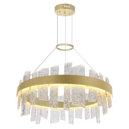 Give your dining room a modern glam glow with the Guadiana 32 inch Round Satin Gold LED Chandelier. This light source is designed with a black metal band embellished with narrow panels of clear textured glass. The overall look is simple yet luxurious which is perfect when you want to give your modern interiors a little sprucing up while still maintaining that air of minimalism. Lighting is jewelry for the home, and there is the perfect piece for every room. This fixture is done in a beautiful satin gold finish which could be the missing piece to lighten up and fall in love with your space all over again.<br/><br/>Features :<br/><br/>- Feel confident with your purchase and rest assured. This fixture comes with a three years warranty against manufacturers defects to give you piece of mind that your product will be in perfect condition.<br/>- Dimensions: H 14" x W 32" x L 32"<br/>- Satin Gold Finish - LED Bulb Not Included - Indoor (Dry Location)<br/>- cETLus Approved<br/>- Includes Assembly Instructions and Hardware<br/>- Compatible With Standard Low Voltage Dimmer.<br/><br/>Specifications :<br/><br/>- Number of Lights : 1<br/>- Voltage : 120v<br/>- Bulb Type : LED<br/>- Warranty Description : Three years warranty against manufacturers defect<br/>- Installation Type : Hardwired<br/>- Material : Metal.