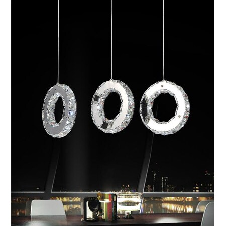 The Ring 3 Pendant LED Chandelier exudes understated elegance that can easily give your modern space a neat and modestly luxurious finish. Hanging from a rectangular canopy in chrome are three rings with faceted crystals and built inch LEDs. The cords are adjustable so you can suspend the three ring pendants to suit your space.Lighting is jewelry for the home, and there is the perfect piece for every room. This fixture is done in a beautiful stainless steel finish which could be the missing piece to lighten up and fall in love with your space all over again.<br/><br/>Features :<br/><br/>- Feel confident with your purchase and rest assured. This fixture comes with a three years warranty against manufacturers defects to give you peace of mind that your product will be in perfect condition.<br/>- Dimensions: H 7" x W 7" x L 24"<br/>- Stainless Steel Finish - Integrated LED Bulb Included - Indoor (Dry Location)<br/>- cETLus Approved<br/>- Includes Assembly Instructions and Hardware<br/>- Compatible With Standard Low Voltage Dimmer.<br/><br/>Specifications :<br/><br/>- Number of Lights : 18<br/>- Voltage : 120v<br/>- Bulb Type : Integrated LED<br/>- Warranty Description : Three years warranty against manufacturers defect<br/>- Installation Type : Hardwired<br/>- Material : Metal.
