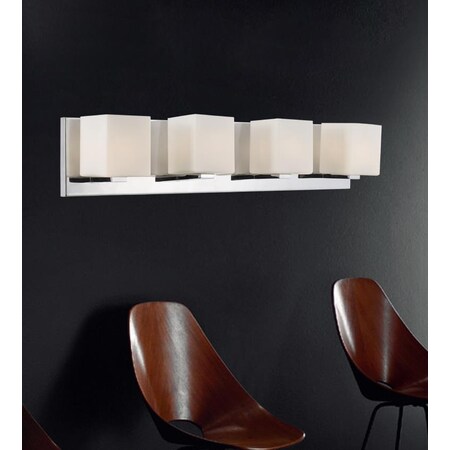 Need a stylish bathroom lighting? Choose the Satin Nickle 4 Light Wall Sconce. This 26 inch long bathroom sconce ticks all the boxes in terms of quality, design, brightness, and style. It has a durable metal hardware in satin nickel finish. The off white boxy glass shades effectively deliver a nice glow. The neat and elegant profile makes this wall light suitable for different interior design schemes.