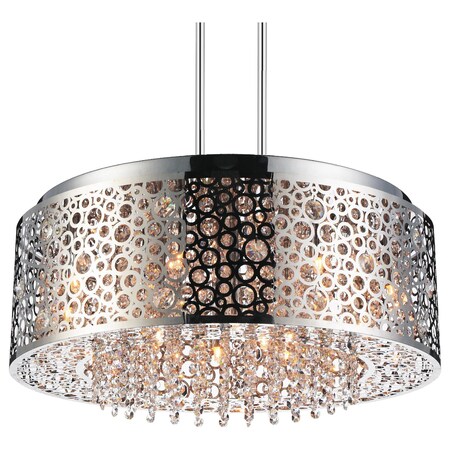 Make your modern space look and feel a little more exciting with this large drum shade chandelier. Exuding a bubbly personality, the Bubbles 9 Light Chandelier features bubble-like laser cuts on its round metal drum shade. From the inside drips strands of tiny round crystal beads that refracts light and cast an elegant twinkle to your space.Lighting is jewelry for the home, and there is the perfect piece for every room. This fixture is done in a beautiful stainless steel finish which could be the missing piece to lighten up and fall in love with your space all over again.<br/><br/>Features :<br/><br/>- Feel confident with your purchase and rest assured. This fixture comes with a one year warranty against manufacturers defects to give you piece of mind that your product will be in perfect condition.<br/>- Dimensions: H 10" x W 24" x L 24"<br/>- Stainless Steel Finish - G9 Bulb Not Included - Indoor (Dry Location)<br/>- cETLus Approved<br/>- Includes Assembly Instructions and Hardware<br/>- Compatible With Standard Low Voltage Dimmer.<br/><br/>Specifications :<br/><br/>- Number of Lights : 9<br/>- Voltage : 120v<br/>- Bulb Type : G9<br/>- Warranty Description : One year warranty against manufacturers defect<br/>- Installation Type : Hardwired<br/>- Material : Metal.