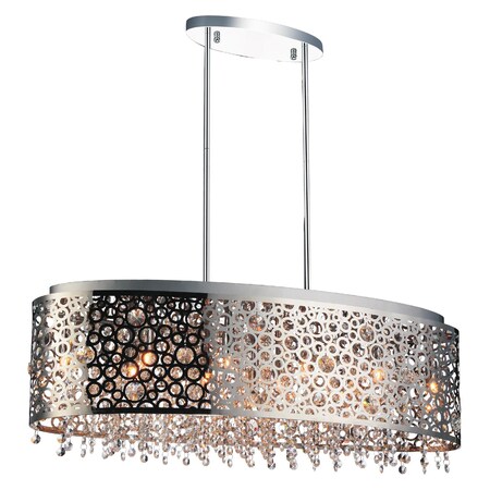 The Bubbles 11 Light Chandelier delivers incredible sophistication with its texture, form, and pattern. This light fixture has an oval drum shade made from laser-cut metal showcasing bubble-like cuts. Dangling from the inside of the shade are crystal strands that sparkle alongside eleven bulbs. This chrome chandelier is sleek and stylish and ready to bring in that added wow factor to your interiors.Lighting is jewelry for the home, and there is the perfect piece for every room. This fixture is done in a beautiful stainless steel finish which could be the missing piece to lighten up and fall in love with your space all over again.<br/><br/>Features :<br/><br/>- Feel confident with your purchase and rest assured. This fixture comes with a one year warranty against manufacturers defects to give you piece of mind that your product will be in perfect condition.<br/>- Dimensions: H 9" x W 10" x L 30"<br/>- Stainless Steel Finish - G9 Bulb Not Included - Indoor (Dry Location)<br/>- cETLus Approved<br/>- Includes Assembly Instructions and Hardware<br/>- Compatible With Standard Low Voltage Dimmer.<br/><br/>Specifications :<br/><br/>- Number of Lights : 11<br/>- Voltage : 120v<br/>- Bulb Type : G9<br/>- Warranty Description : One year warranty against manufacturers defect<br/>- Installation Type : Hardwired<br/>- Material : Metal.