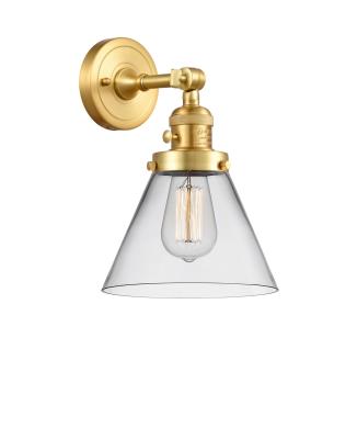 This Wall Sconce from the Cone collection by Innovations Lighting will enhance your home with a perfect mix of form and function. The features include a Satin Gold finish applied by experts. Product Features Include: Brand: Innovations Lighting, Collection: Cone, SKU: 203SW-SG-G42-LED, UPC: 729625164729, Category: Wall Sconce, Finish: Satin Gold, Glass: Clear, Shade: Clear Glass, Material: Steel/Cast Brass/Glass, Designer: Bruno Marashlian, Length: 9.00 in., Width: 8.00 in., Height: 10.00 in., Backplate/Canopy Width: 4.50 in., Backplate/Canopy Length: 4.50 in., Backplate/Canopy Thickness: 0.75 in., Install Position: Vertical, Weight: 3.15 lb., Switch: Socket, Bulbs Included: No, Bulb Category: LED, Primary Bulb(s): x 3.50 watts Medium Base LED, Voltage: 120, Safety Rating: UL, cUL, ETL, cETL Damp, Title 20 Approved