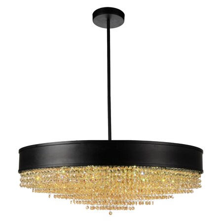 Let the Medina 15 Light Chandelier bring brightness and glamor to your space. This light fixture is designed with a 30 inch drum shade with a black band holding tightly knit crystal beads that looks extra stunning in its tiered like formation. Designed with an elegant color combination, this light source will welcome your guests with a golden glow and a luxurious vibe that will impress but not overwhelm.